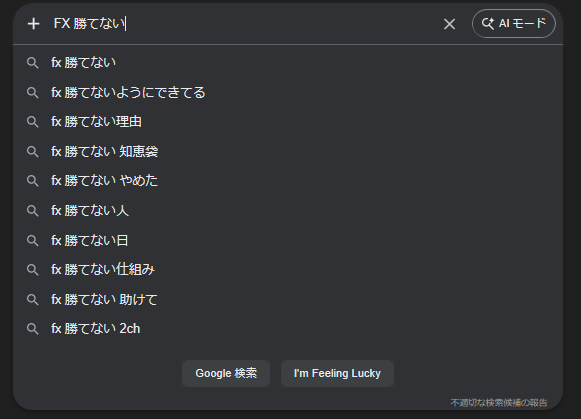 グーグルの検索窓に「FX 勝てない」と入力すると、こんな感じで検索されているのがわかります。